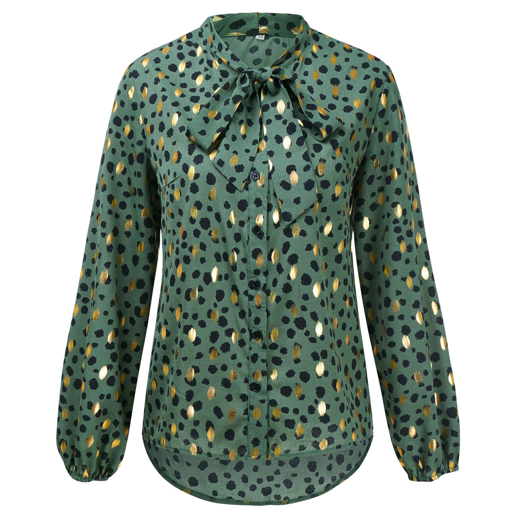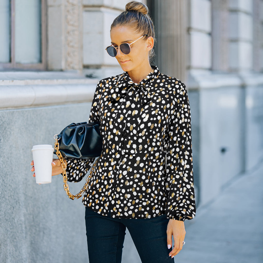 بلوزة نسائية منقوشة مع ذوي الياقات البيضاء والأكمام الطويلة