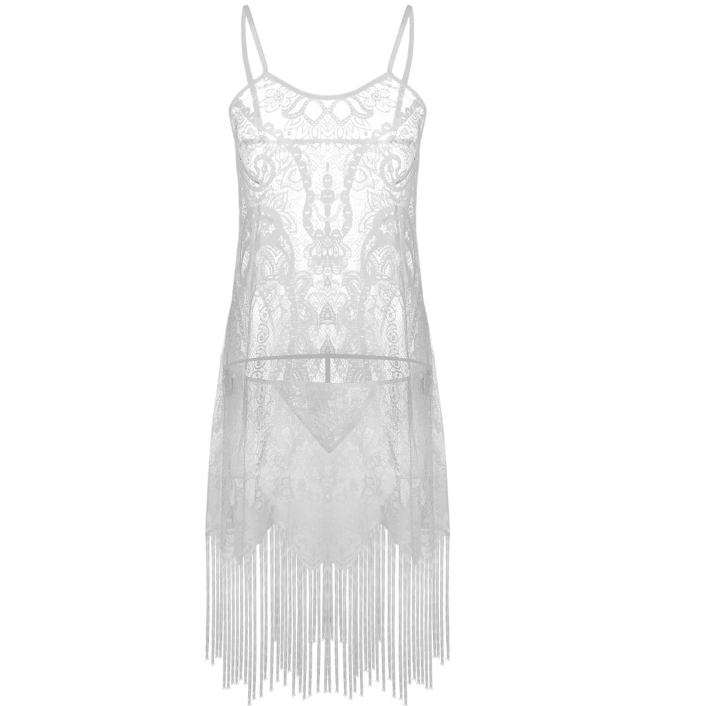 أدلي ببيان عندما تكتسح الغرفة التي ترتدي مجموعة الملابس الداخلية Fringe Hem Lace Brocade ، والتي تتميز بجسم دانتيل شفافًا ومشاهدة طويلة وأنيقة على طول القاع.