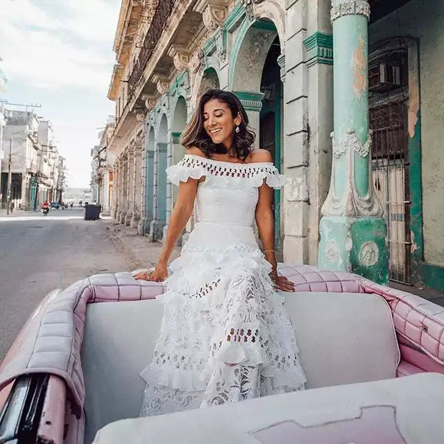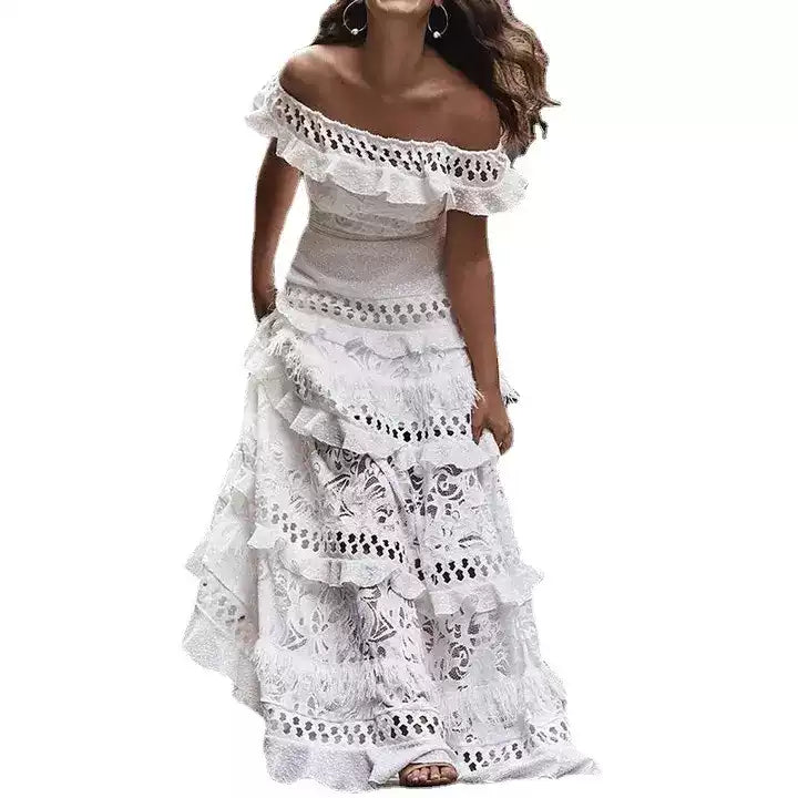 فستان ماكسي المتدرج الكروشيه مع خط العنق على الكتف