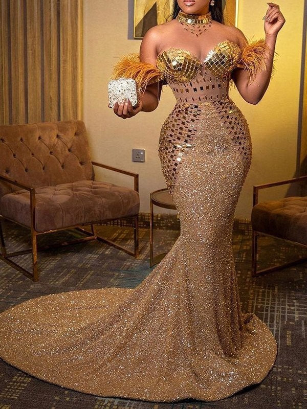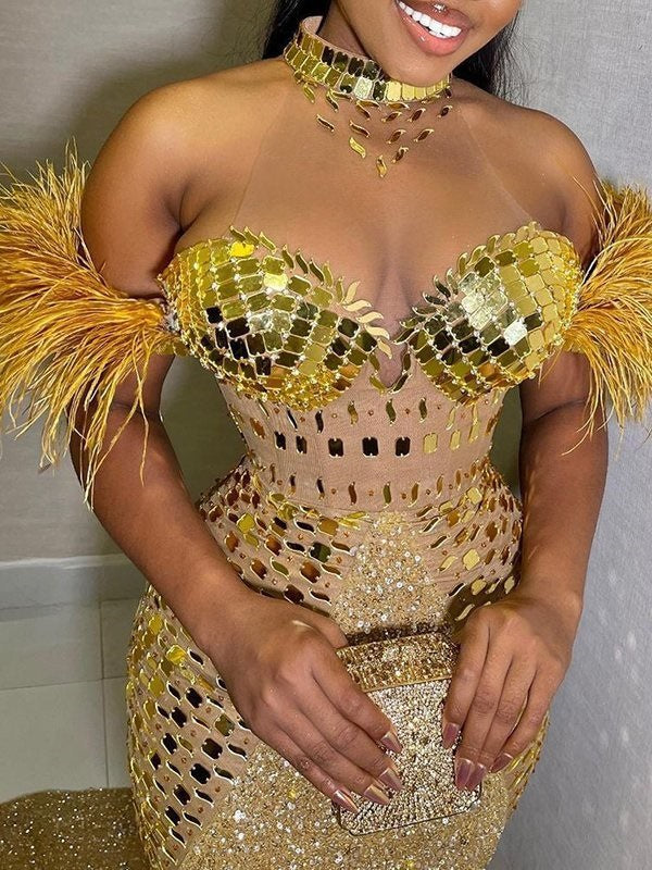 Seien Sie bei jedem Event der Star der Show und tragen Sie das goldglitzernde Damenkleid mit herzförmigem Ausschnitt. Dieses figurbetonte Kleid betont Ihre Figur und umschmeichelt Ihre Kurven, während es im Licht erstrahlt.