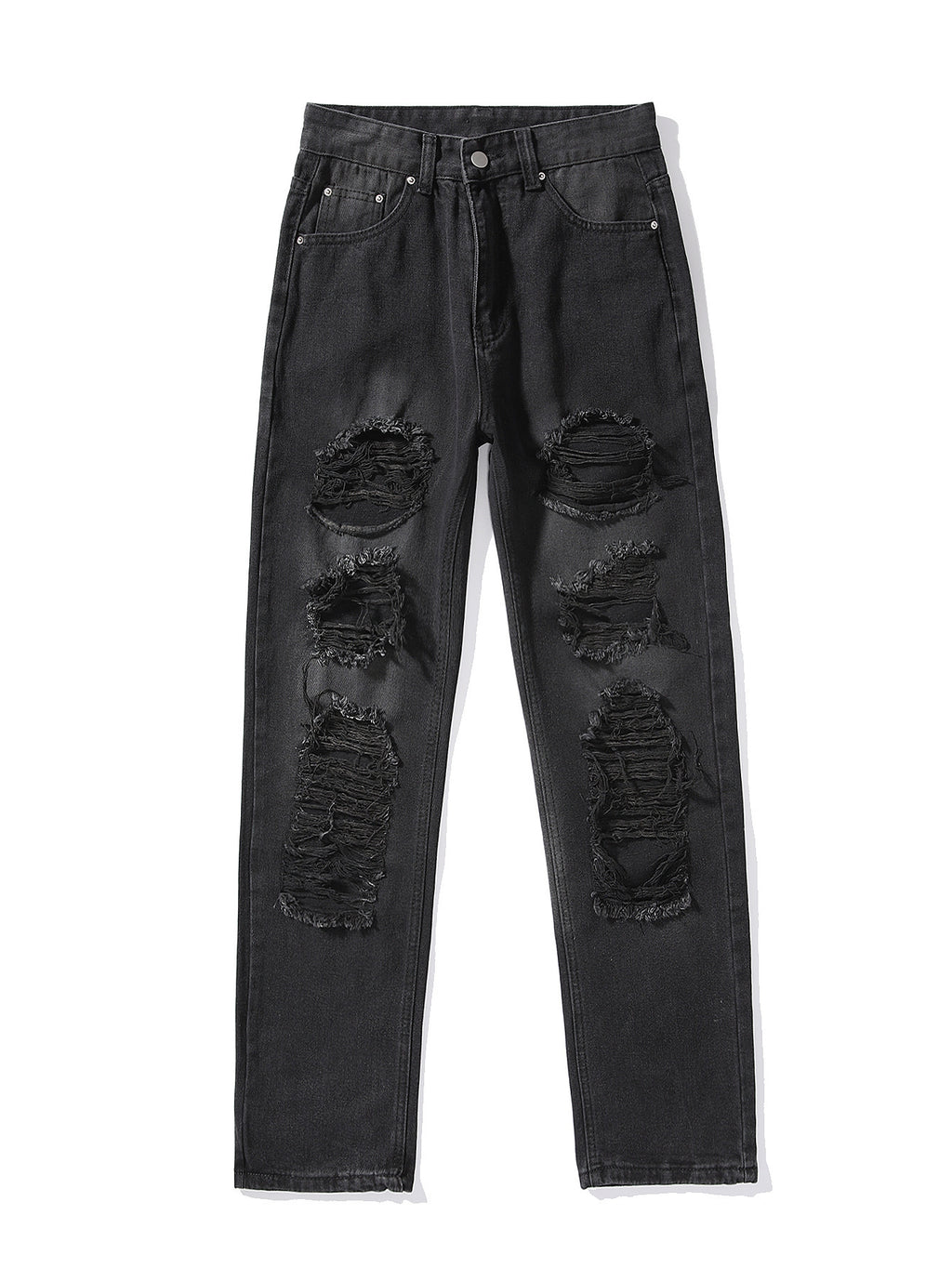 Se démarquez dans la rue dans les jeans en vrac haute taille féminins avec des déchirures et des larmes. De la cuisse au tibia se trouvent de grandes déchirures et un denim usé qui les fait sortir.