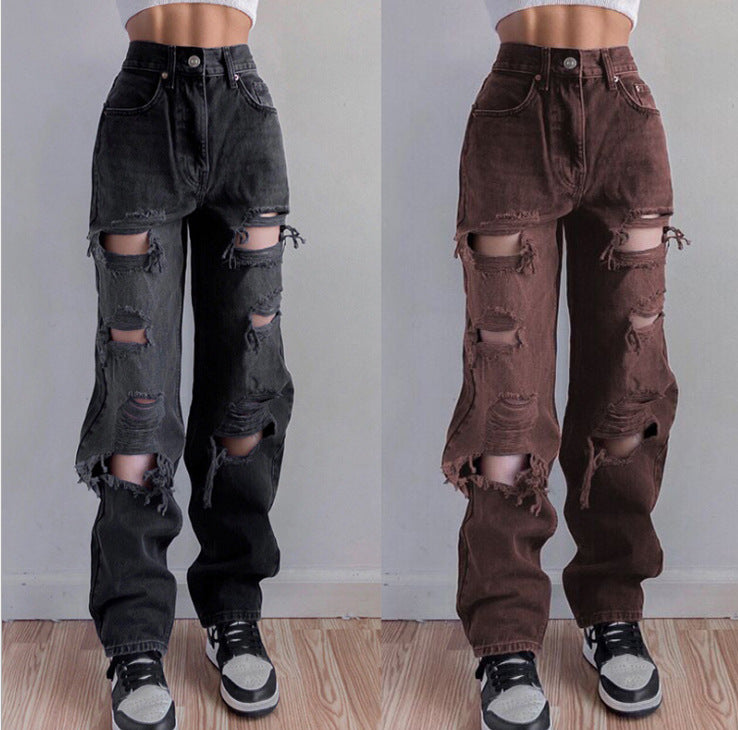 Jeans ajustés en vrac haute taille pour femmes avec des déchirures et des larmes