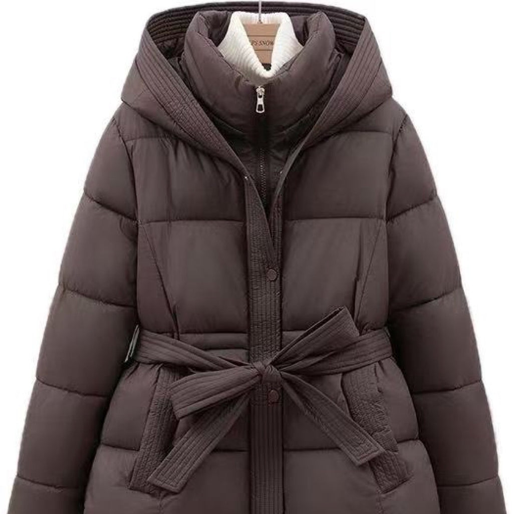 Women's Short Waist-cinching Slim-fit Hooded Tie-front Warm Coat