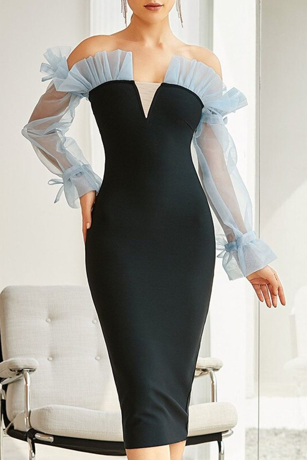 फार्म फिटिंग पेंसिल स्कर्ट मिडी पोशाक हल्के नीली आस्तीन और फ्रिली चोली के साथ
