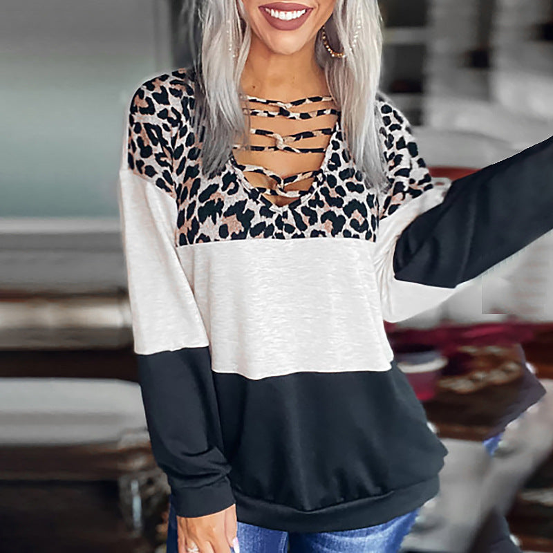 अपने आकस्मिक कपड़ों में जंगली पक्ष पर टहलें महिलाओं के सफेद और काले ब्लाउज पहने हुए तेंदुए प्रिंट चेस्ट पैटर्निंग के साथ, जिसमें अंत से अंत तक चलने वाली पट्टियों के साथ एक वी-नेक है।