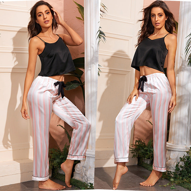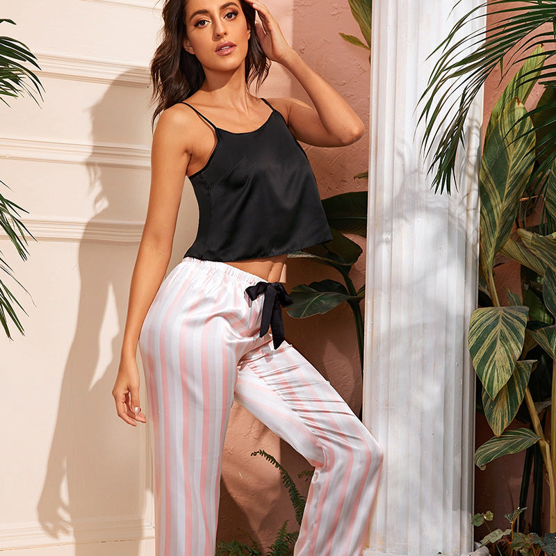 महिलाओं के रेशमी टैंक टॉप और पैंट पजामा सेट में रात भर प्यारा और आरामदायक महसूस करें। ब्लैक टैंक टॉप ब्लैक रिबन से मेल खाता है जो आपको गुलाबी और चांदी की पैंट के फिट को समायोजित करने की अनुमति देता है।