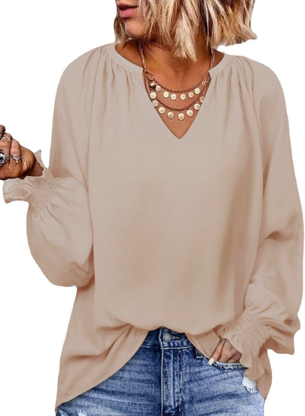 रेकड विवरण के साथ रेशमी वी-गर्दन लंबी आस्तीन वाली शर्ट