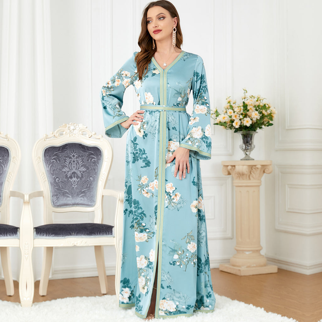 Silky and chic, the Women's Long Sleeve Light Blue Floral Gown is the perfect choice for a springtime evening event. It features sleek, soft loose-fitting fabric.