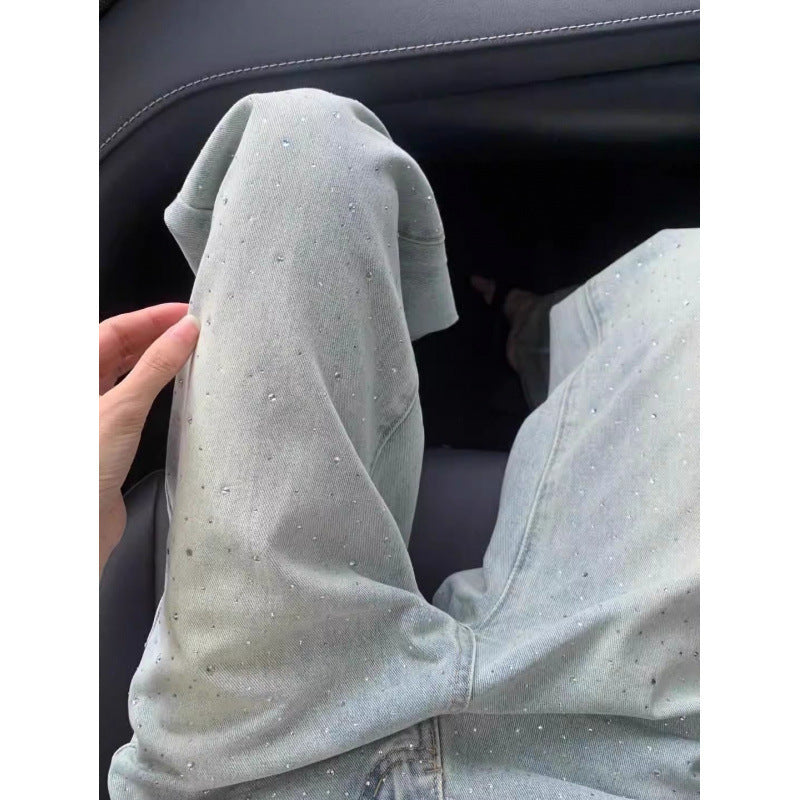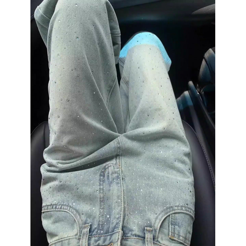 デザイナーのラインストーンジーンズがドレープされたスリムの広い足の形状
