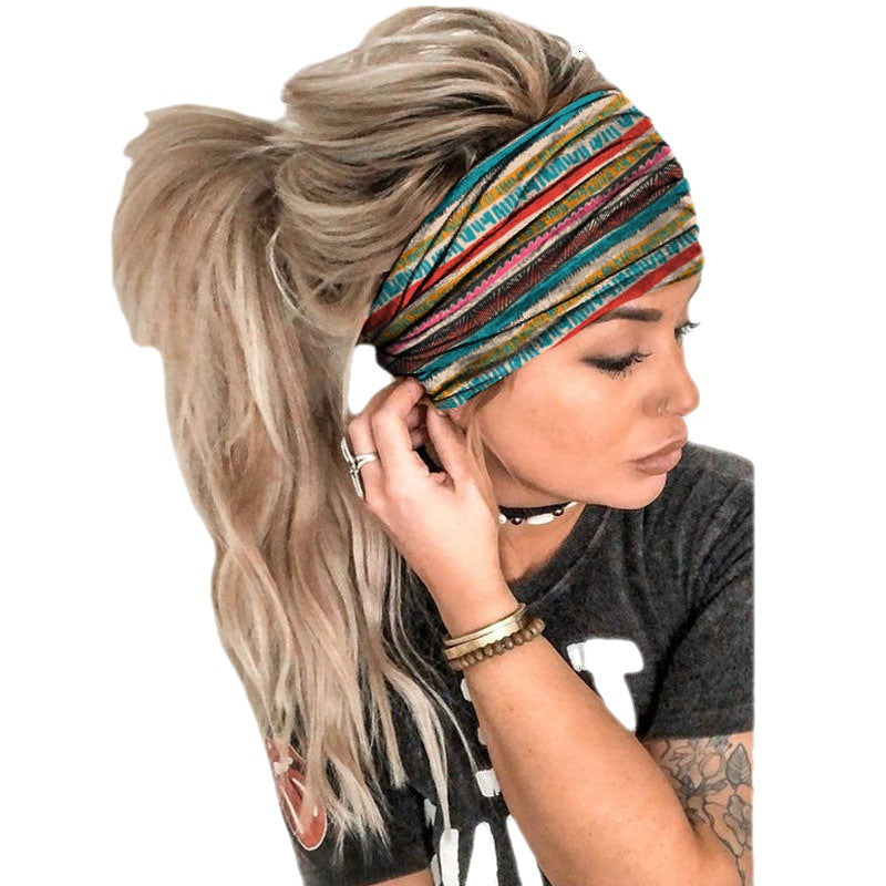 髪を目から遠ざけ、さまざまな光沢のある色合いのストライプを特徴とする女性の頭をラップボヘミアンシックヘッドバンドでスタイリッシュにしてください。