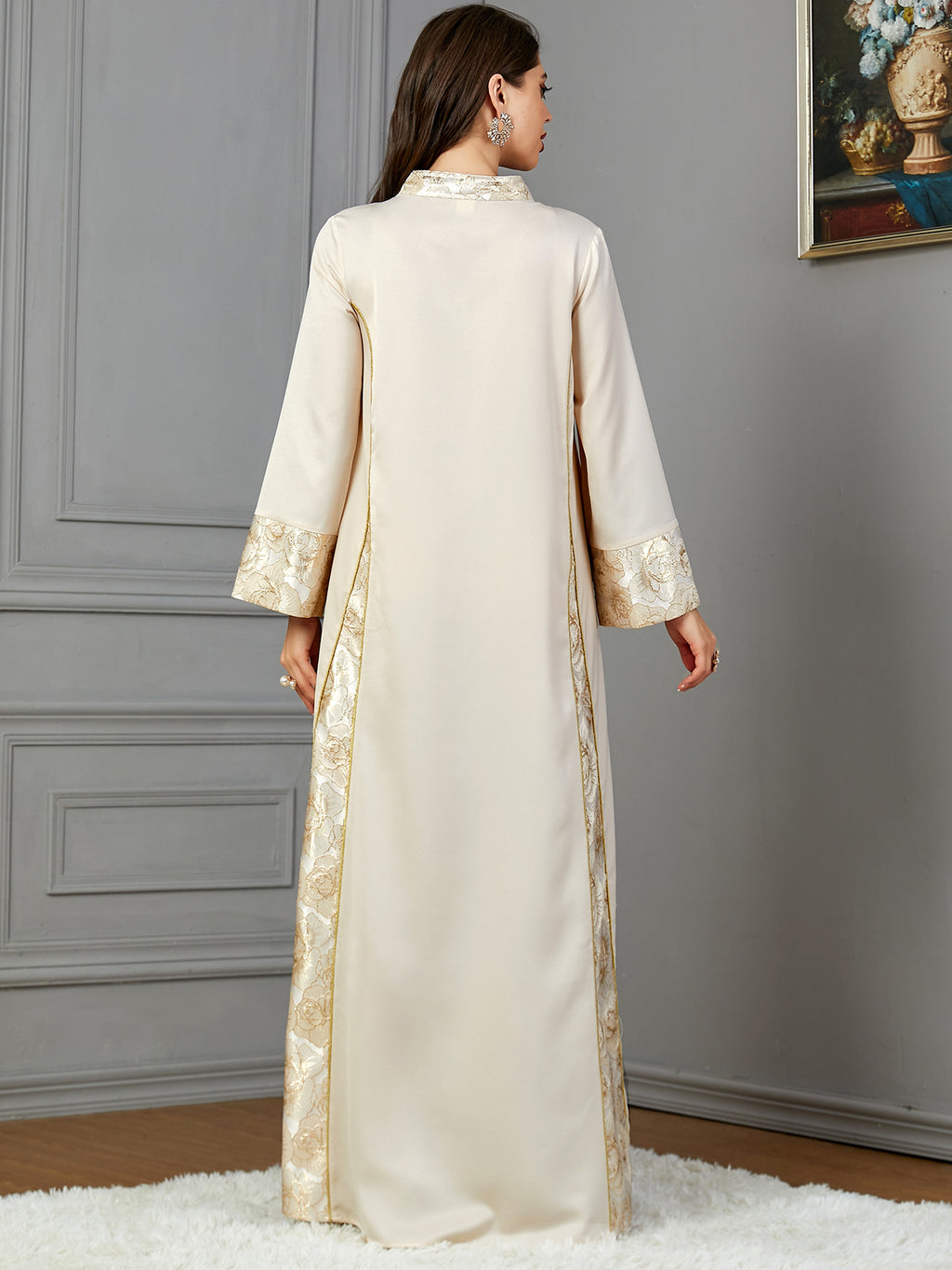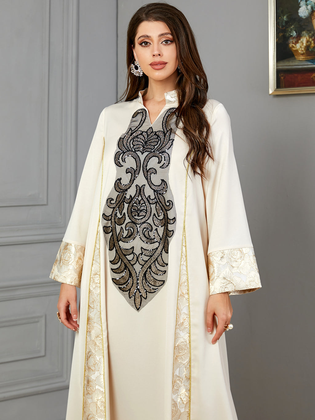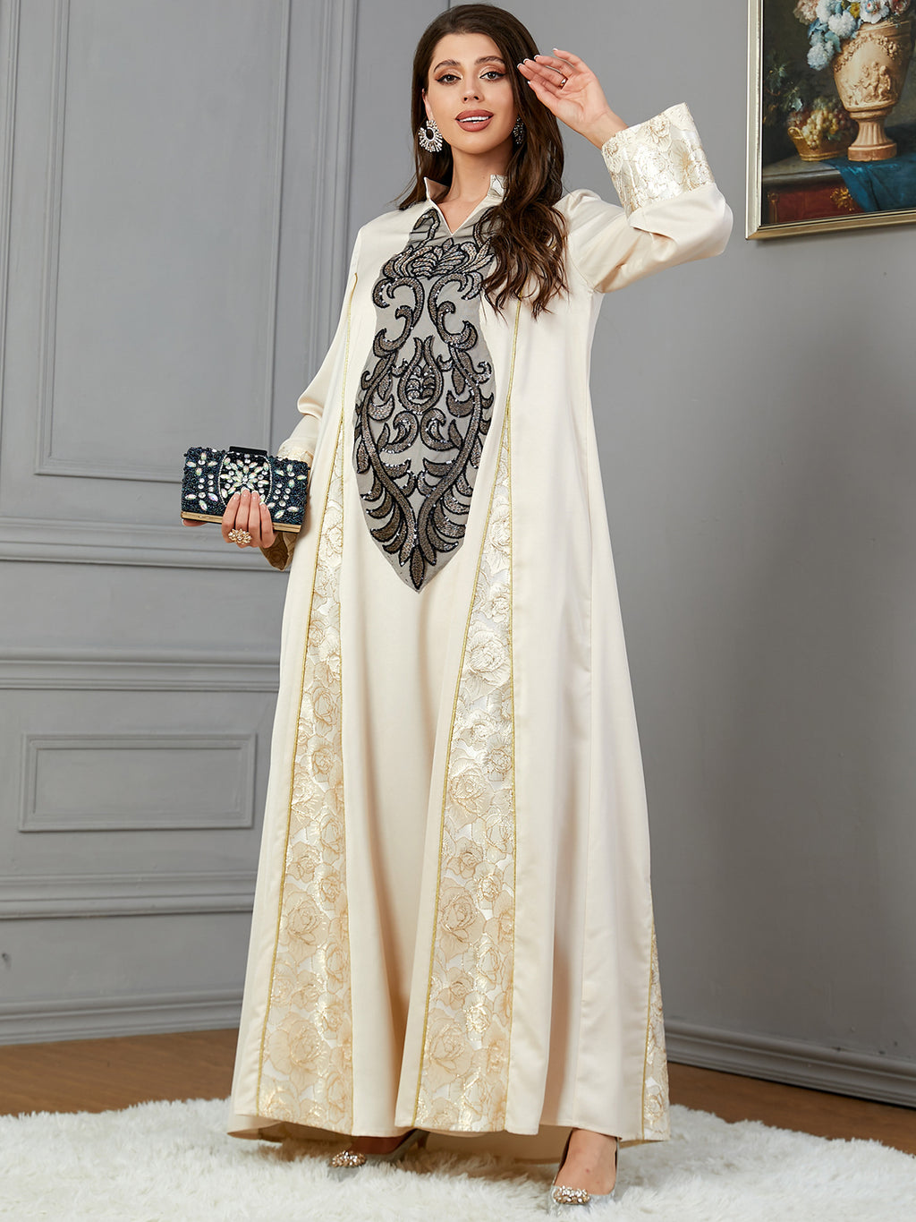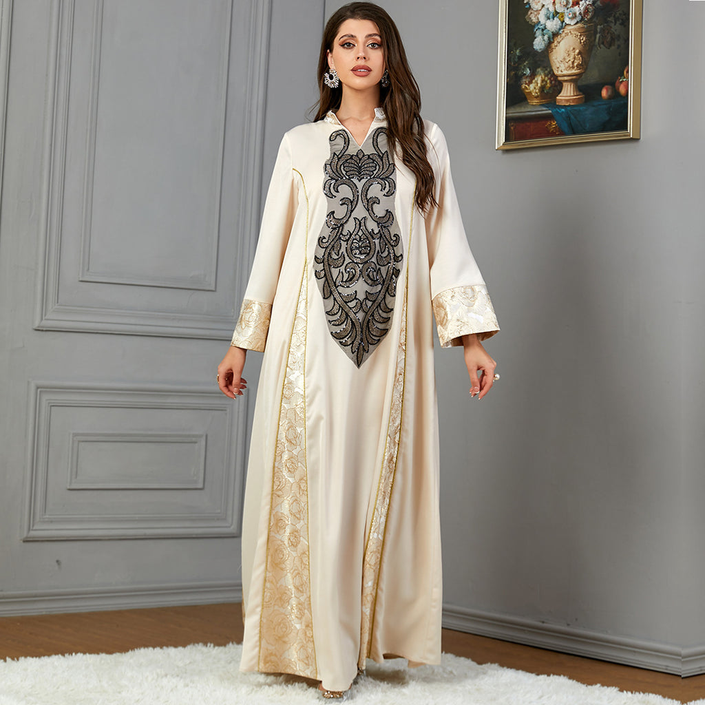 Stand out wherever you go in this Women's Elegant Long Sleeve Maxi Dress with Turn Down Collar. It comes in your choice of champagne and black or blue and silver.