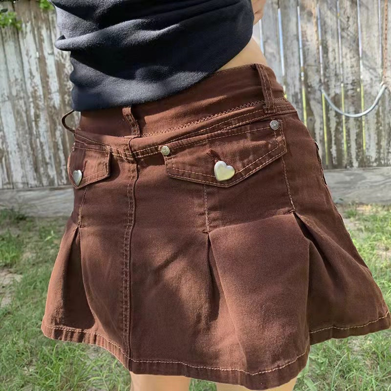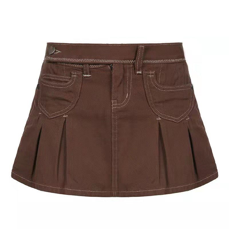 Look cute and flirty in the Women’s Light Brown Mini Skirt with Flared Hem. They feature mock denim pockets by the hips as well as metal buttons.