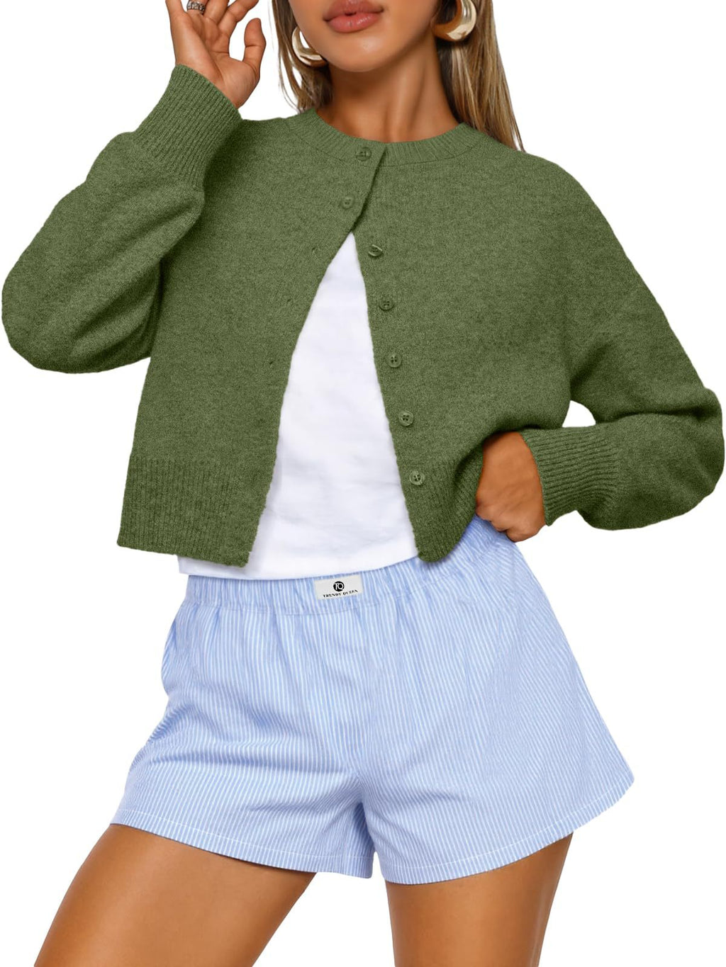 Buttoned Long-sleeve Crew-neck Solid-color Cropped Knit Sweater