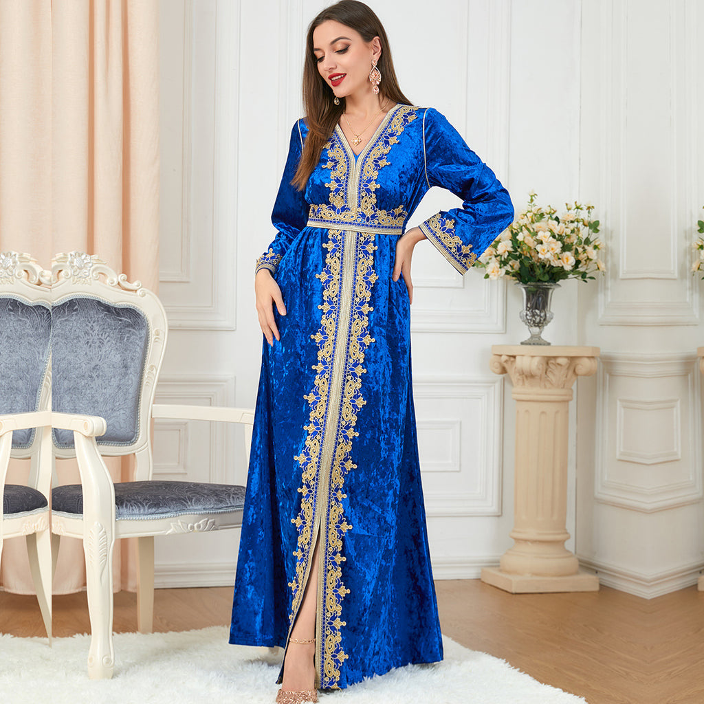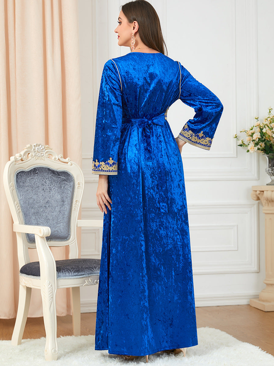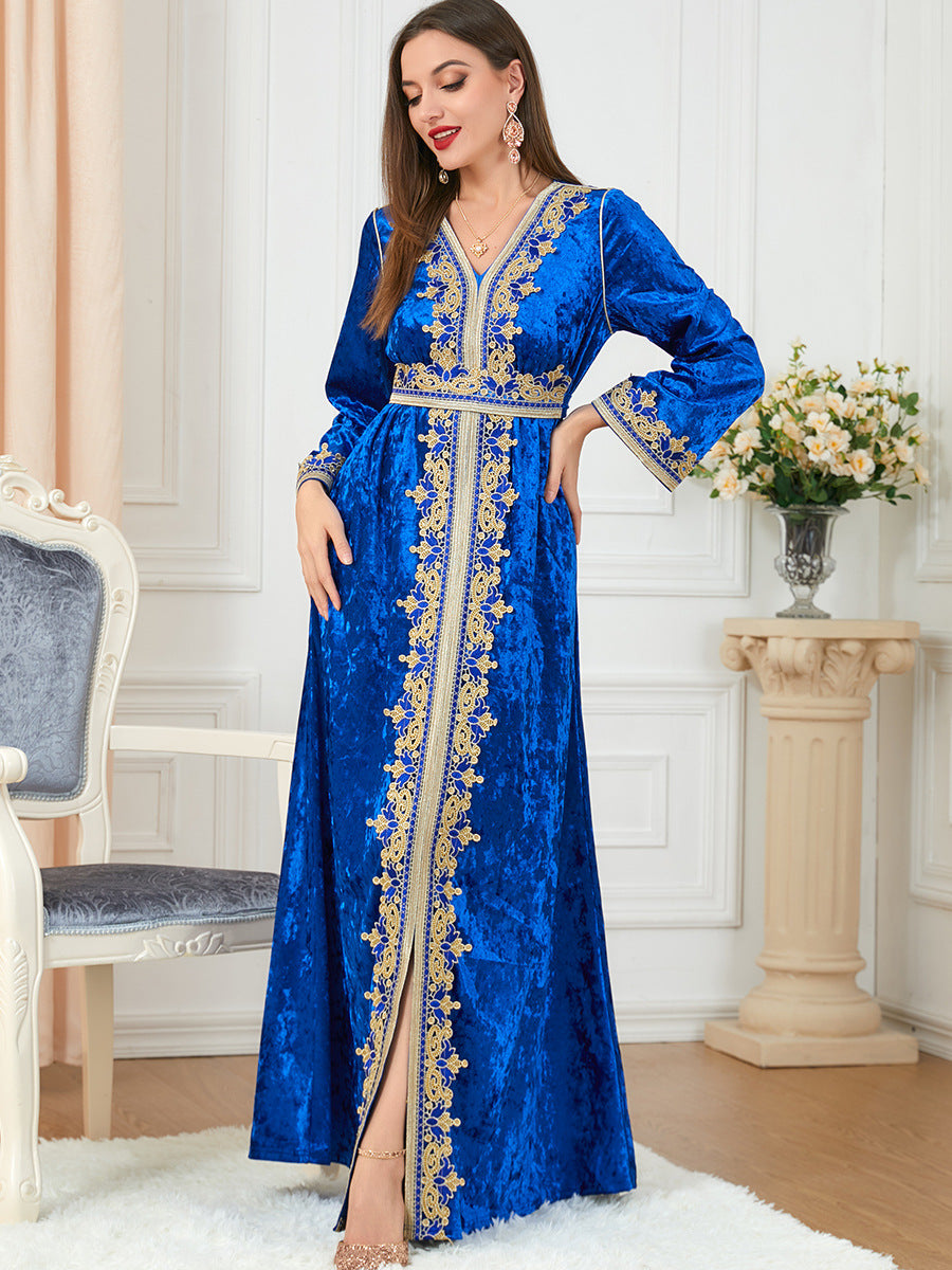 Women's Long Sleeve Velvet Maxi Gown with Gold Trim