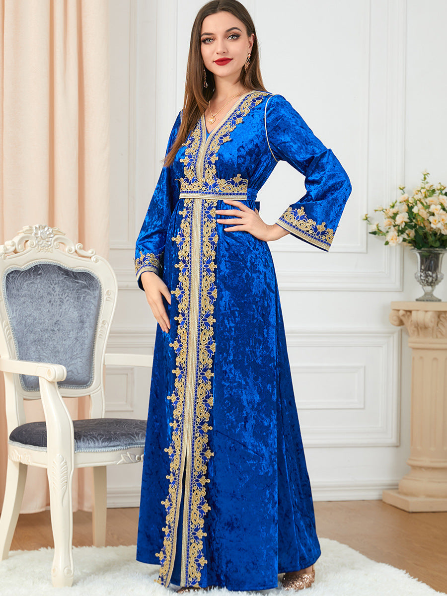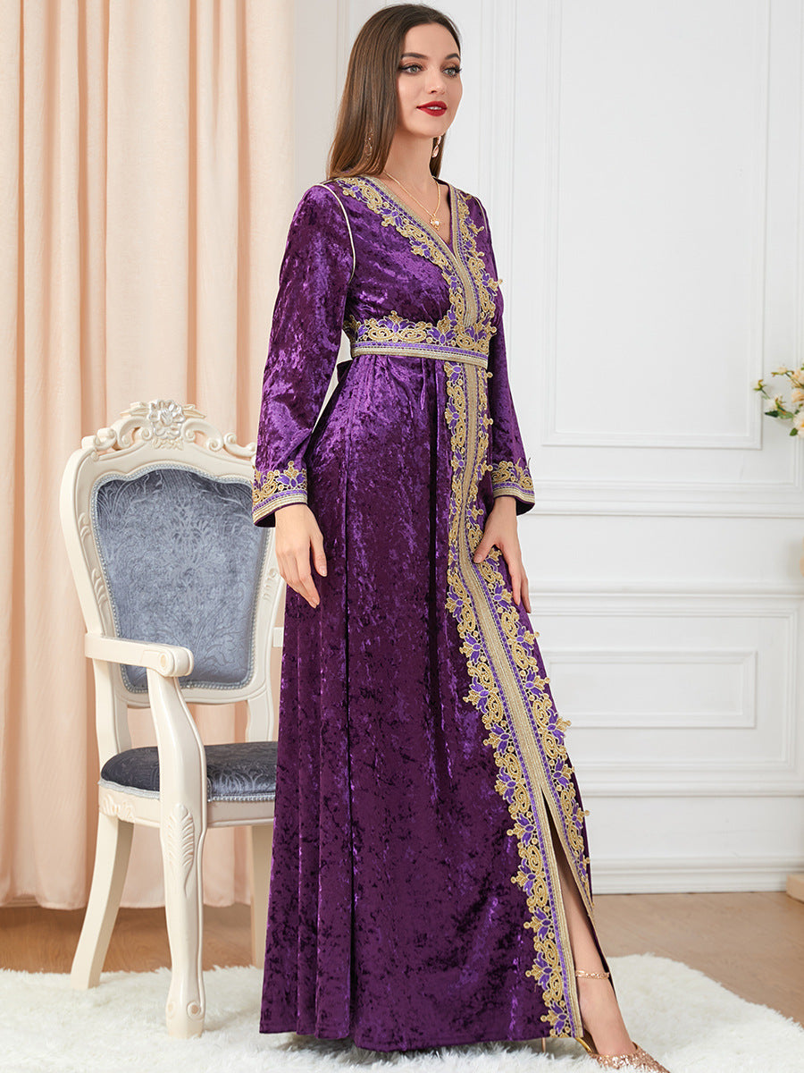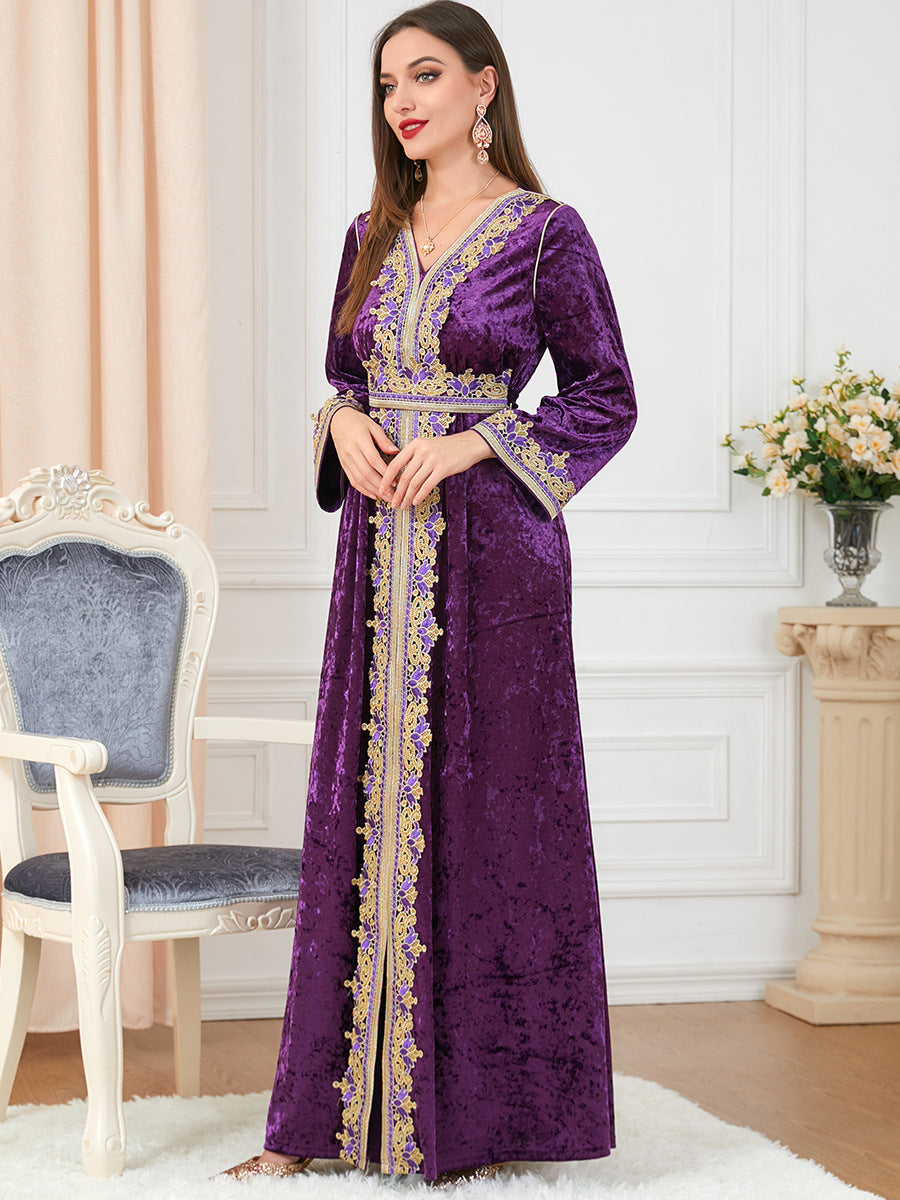Women's Long Sleeve Velvet Maxi Gown with Gold Trim