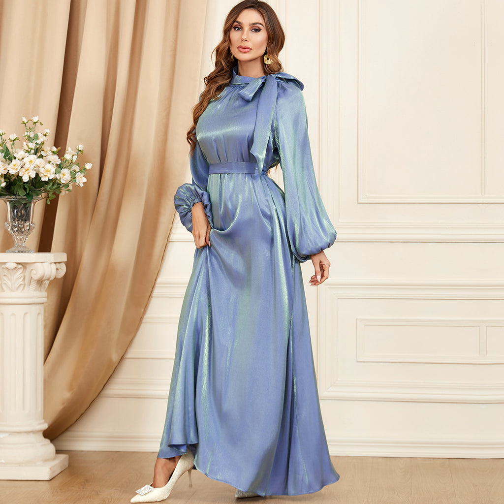 Make a colorful statement in the Women's Long Bishop Sleeve Maxi Gown. This dress features a beautiful sash tie around the neck and comes in blue or purple.