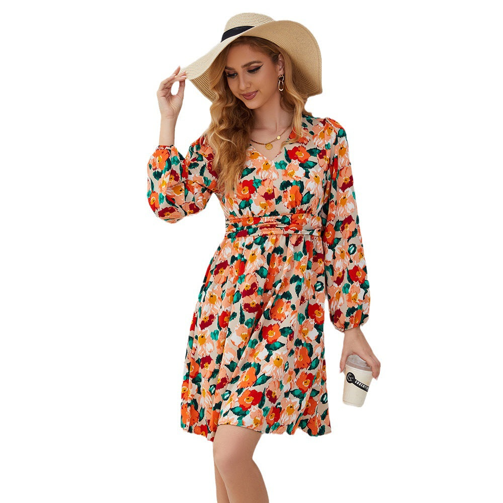 Show off your playful personality with the Women's Long Sleeve Floral Print Midi Print that stands out with its vibrant sunset colors of yellow, orange and red.